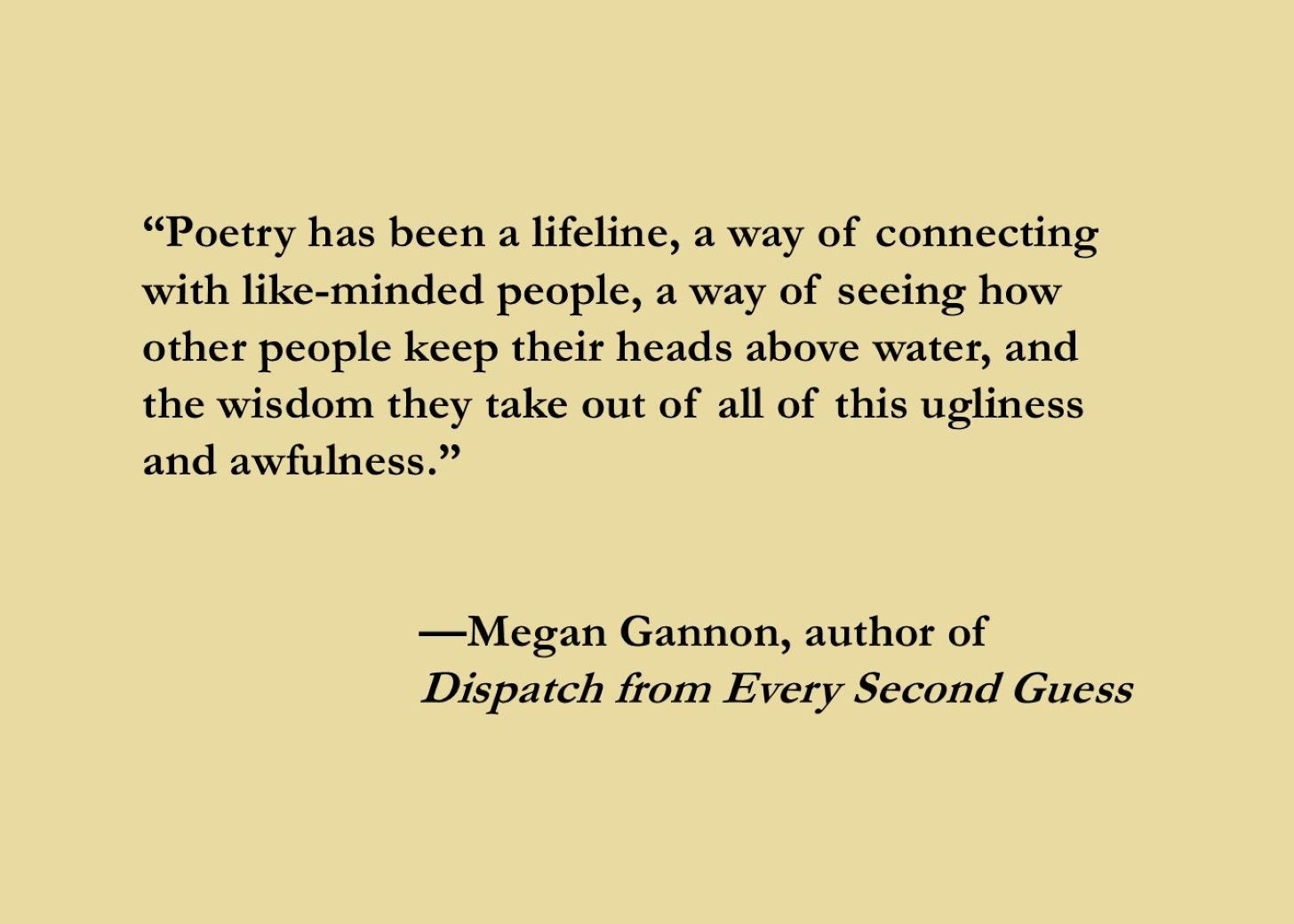 MG: Poetry has been a lifeline, a way of connecting with like-minded people, a way of seeing how other people keep their heads above water, and the wisdom they take out of all of this ugliness and awfulness.